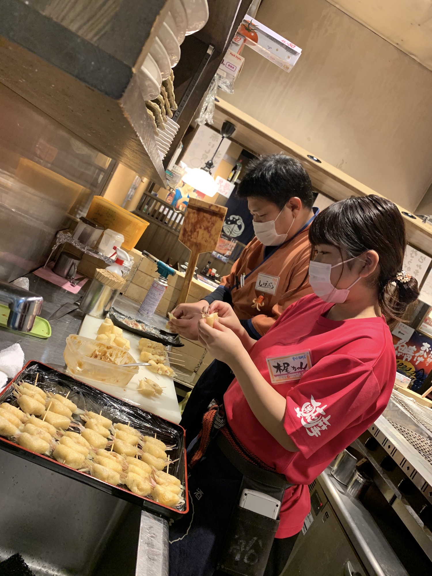 写真は伏見店人気ベスト5にランクインしているみょうがあげ包み串を張り切って仕込みをしている梶ちゃんとしげぶうです😏